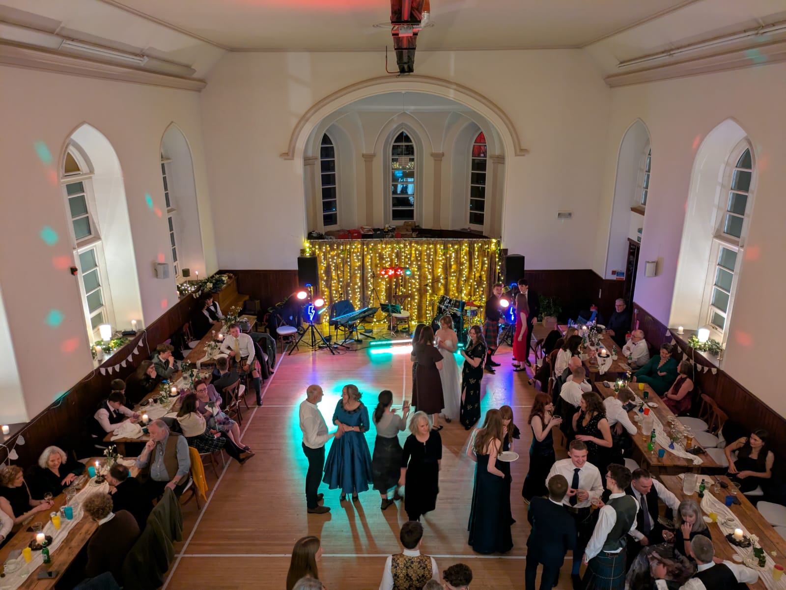 Our cèilidh package is perfect for all kinds of events: weddings, parties, charity evenings, corporate events or student nights. A typical cèilidh package includes a four hour hire of our three-piece band (including a break), dance calling, and a disco set. We have a wide repertoire of cèilidh dances, including old favourites like the Dashing White Sergeant, and less well-known options like the Pat-a-Cake Polka. To ensure that everyone has a chance to get up and dance, we perform a mixture of fast, slow, couples, and group dances.